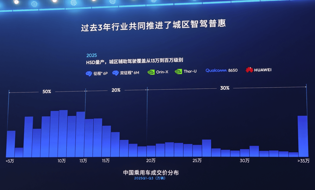 然而,在余凯看来,真正的“智驾平权”尚有最后一道藩篱。他展示了一幅清晰的市场演进图:2024年,好用的城区NOA功能主要覆盖20万元以上车型;2025年,这一门槛已下探至13万元级别。“但是,占据中国市场半壁江山、价格在10万元级的国民车,难道就不配拥有好用的城区辅助驾驶吗?”